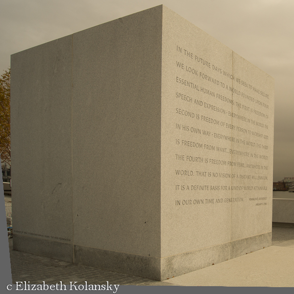 The Franklin D. Roosevelt Four Freedoms Park situated at the tip of Roosevelt island is a pleasant respite for the sensory overloaded of New York City. Architect Louis EI. Kahn designed an austere cool symmetry that channels our focus away from the adjacent skylines towards the rather tame vista of the southern Hudson River. I was lucky enough to be there on a quiet day with few visitors to disrupt this meditative landscape and took a moment to actually contemplate the four freedoms. Does the Park live up to those four freedoms?