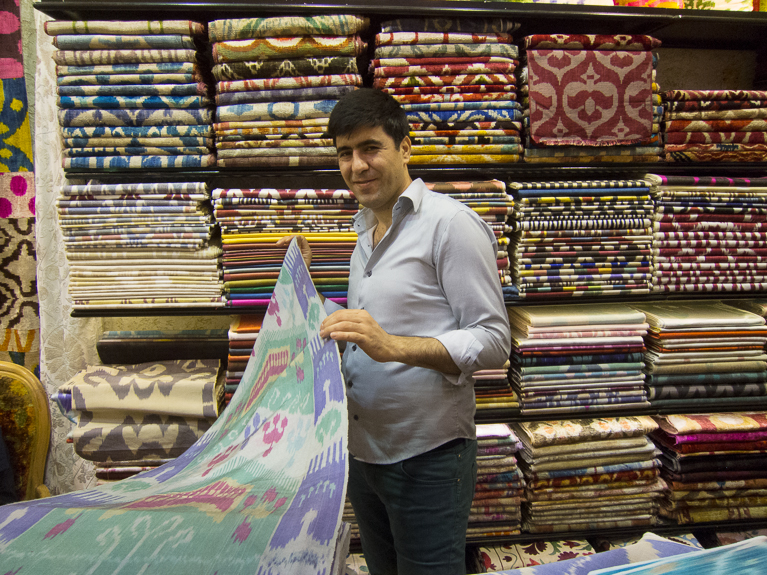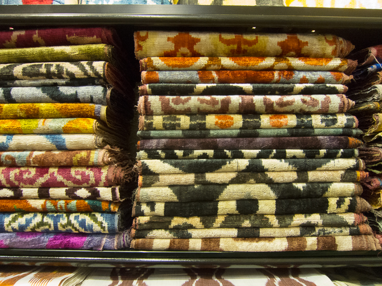 I just returned from Turkey and discovered this wonderful fabric shop located in the Bazaar in Istanbul . The textiles are not Turkish however but come from Uzbekistan. Prices for the velvet ikats were 90 to 120 Turkish Lira. That is $45 to $60.00 a meter. So, not inexpensive. Unfortunately the few fabric shops that were geared for local non tourists were very disappointing, with a very small selection and mostly ugly rayon prints. The prints are seen mostly in the headscarves the women wear and hopefully I can find some pictures that I can post.