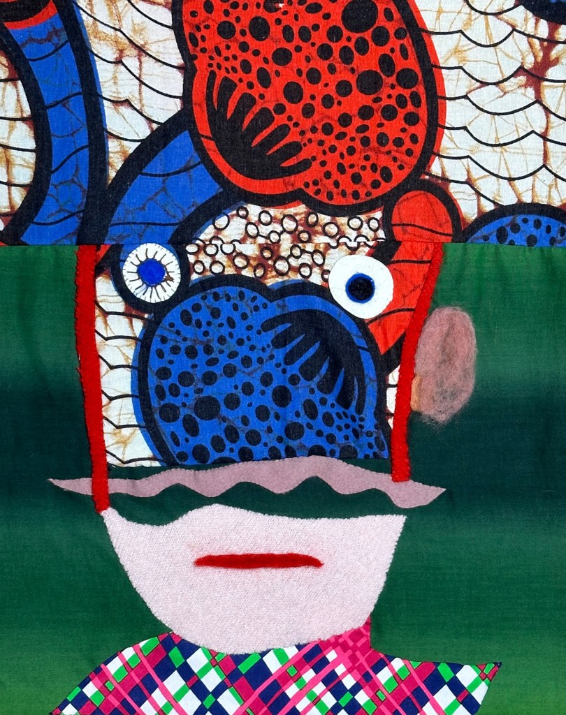 Handsewn and embroidered patchwork from fabric scraps, felt hats and roving employs traditional tools and techniques. The quality of workmanship once a measure of a woman’s worth is mindfully engaged in the execution of these pieces